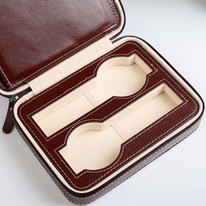 Шкатулка кожзам под часы 4 отделения "Белая строчка на кофейном" 6х18х14 см