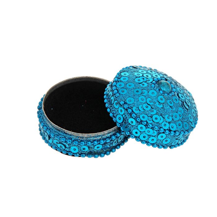 Шкатулка круг "Индиго" — исключительно ручная работа! Металлическая шкатулка покрыта необычными золотниками и украшена яркими узорами из пластикового декора. Преподнесите эту индийскую экзотику в качестве подарка!