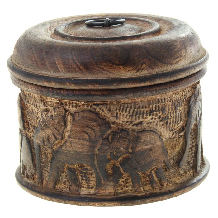 Внушительная шкатулка круглая "Слоны" выполнена вручную индийскими мастерами-ремесленниками из натурального массива дерева. Вы только взгляните на утолщённые стенки этого прекрасного аксессуара, в такой шкатулке все Ваши украшения будут в надёжном месте. Оригинальный орнамент, форма, приятный цвет дерева - всё это будет замечательно сочетаться с любым интерьером, будь то спальная или гостиная. Это не просто шкатулка, это настоящее произведение искусства, истинная ручная работа, которая станет не только приятным предметом женского обихода, но и ценным подарком любому ценителю красоты и экзотики.