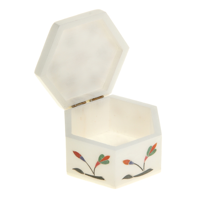 Над чем никогда не задумаются представительницы прекрасного пола, так это над тем, чем можно заполнить такую шкатулку: в нее можно положить самые памятные украшения — сережки, подаренные любимым человеком, или часики, которые Вы надеваете каждый день. Оригинальная шкатулка родом из Индии словно проникнута неповторимым колоритом этой страны. Она выполнена из алебастра — материала, который индусы называют «итальянским мрамором» благодаря его прочности и гладкой поверхности. Шкатулка "Соцветие" шестиугольная под белый мрамор станет удобным местом для хранения Ваших вещиц и одновременно с этим – заметным украшением интерьера.