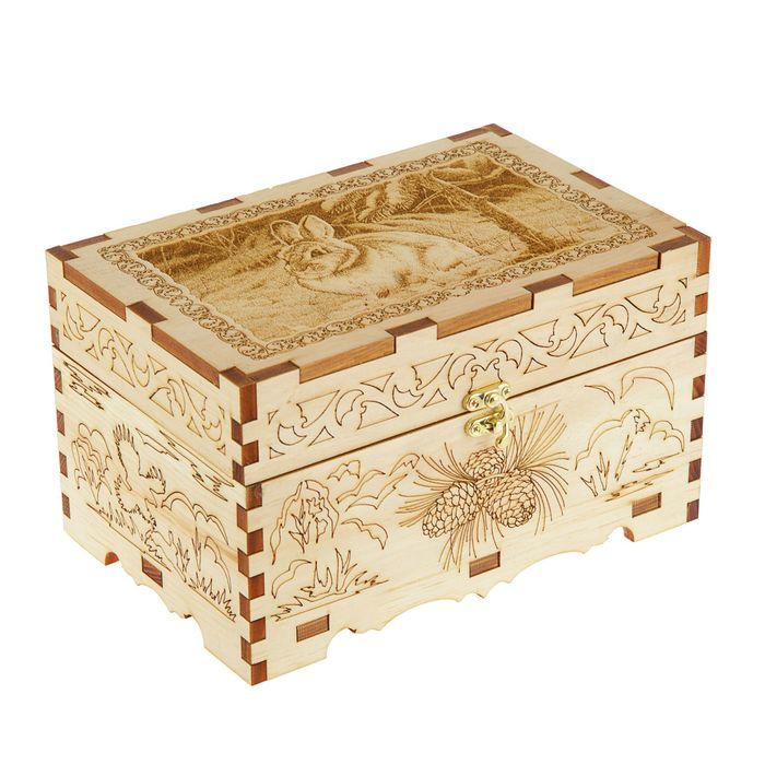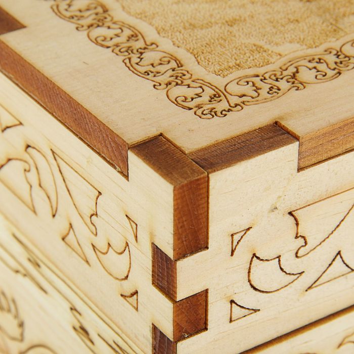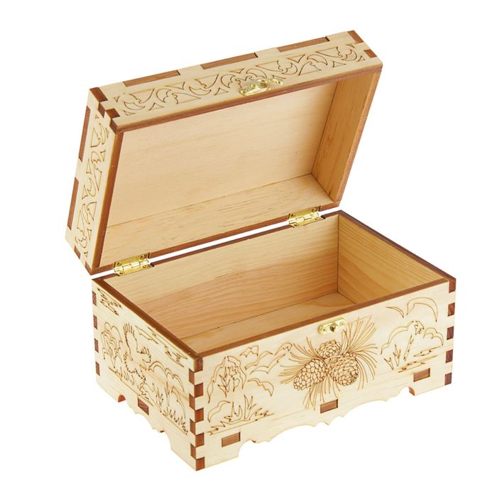 Шкатулка из натурального кедра выполнена с использованием лазерных технологий путём обжига и вырезания. Благодаря этому дизайн получился необычным. Храните в этом сундучке украшения или просто дорогие сердцу вещи, а он будет радовать вас ароматом таёжных лесов.