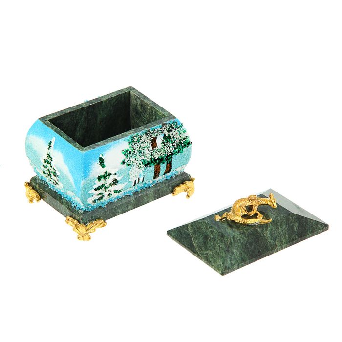 Шкатулка "Зима" с рисунком и ящеркой на ножках 5х7 см змеевик станет замечательным подарком спортсменам, врачам и фармацевтам, юристам и бизнесменам, учащимся и обучающим. На лицевой поверхности изделия допускаются прожилки и полосы, не ухудшающие декоративные свойства. На обороте допускаются незначительная пористость, волнистость, следы инструмента.