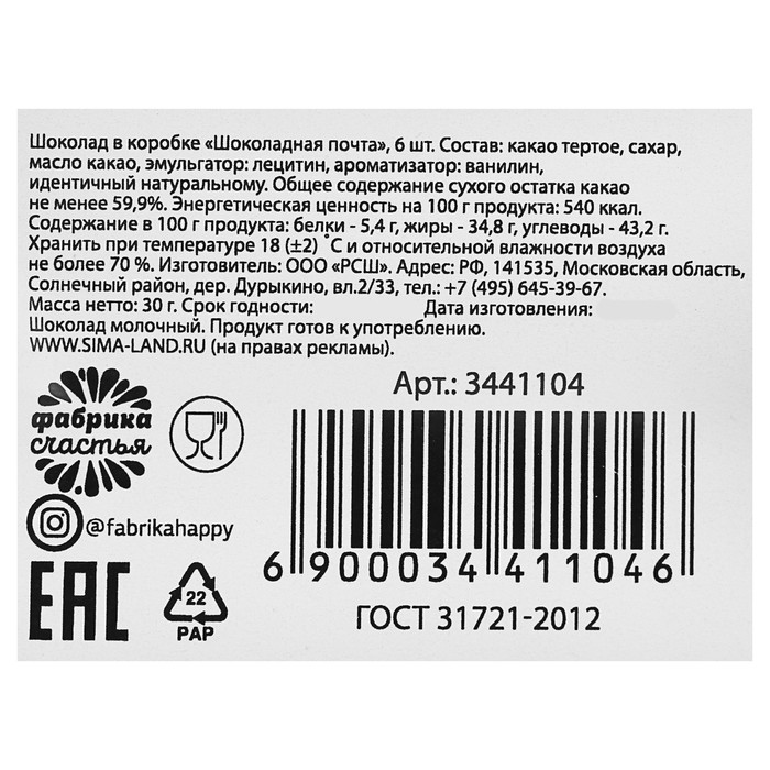 Шоколад 5г в коробке "Шоколадная почта", 6 шт