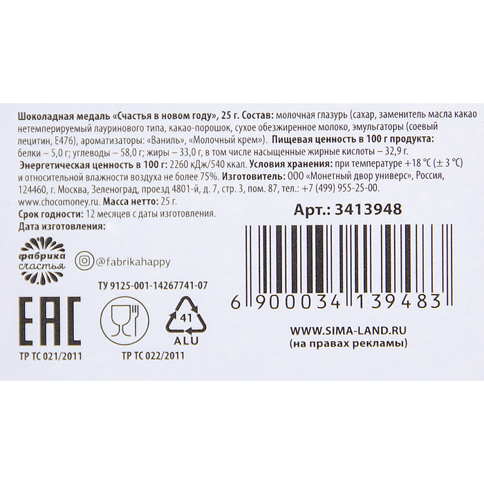 Шоколадная медаль "Счастья в Новом году", 25 г