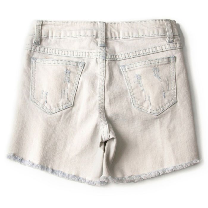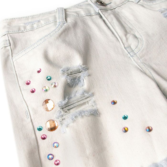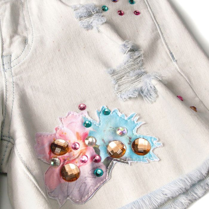 Особенности: шорты с эффектом потёртостей сшиты из светлой ткани, украшены яркими стразами и аппликацией.