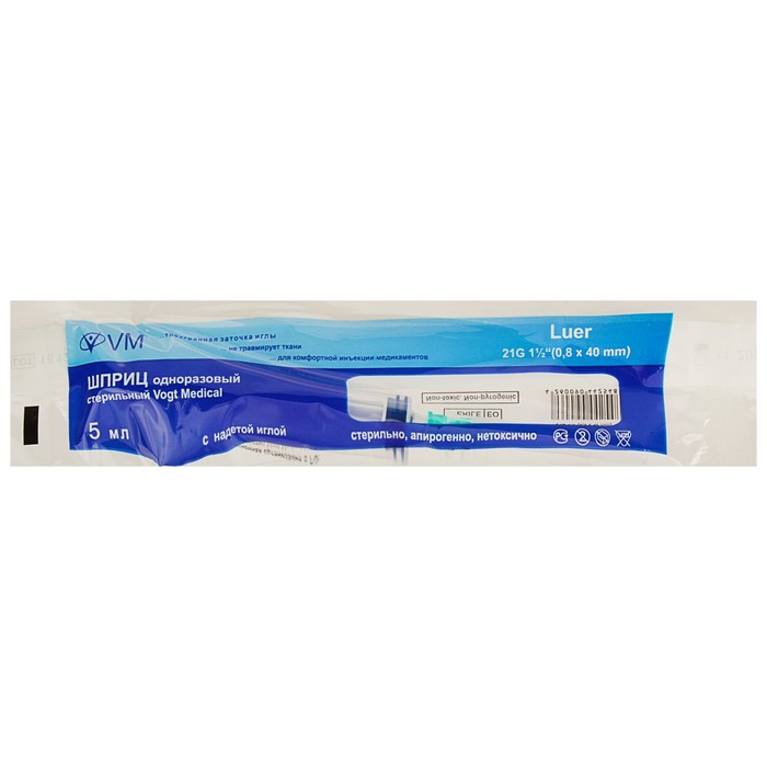 Шприц Vogt Medical 5 мл трехкомпонентный с надетой иглой 22G (0,7x30мм)