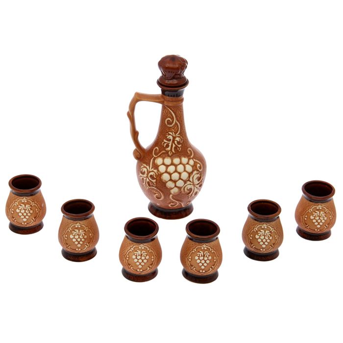 Штоф — это сосуд для крепких спиртных напитков. Он предназначен для хранения вина, водки, коньяка и настойки. К нему прилагаются оригинальные рюмки соответствующей тематики.Набор изготовлен из керамики — прочного материала, способного сохранять температуру жидкости до 4 часов, поэтому вы сможете наслаждаться охлаждёнными напитками даже во время долгих застолий.