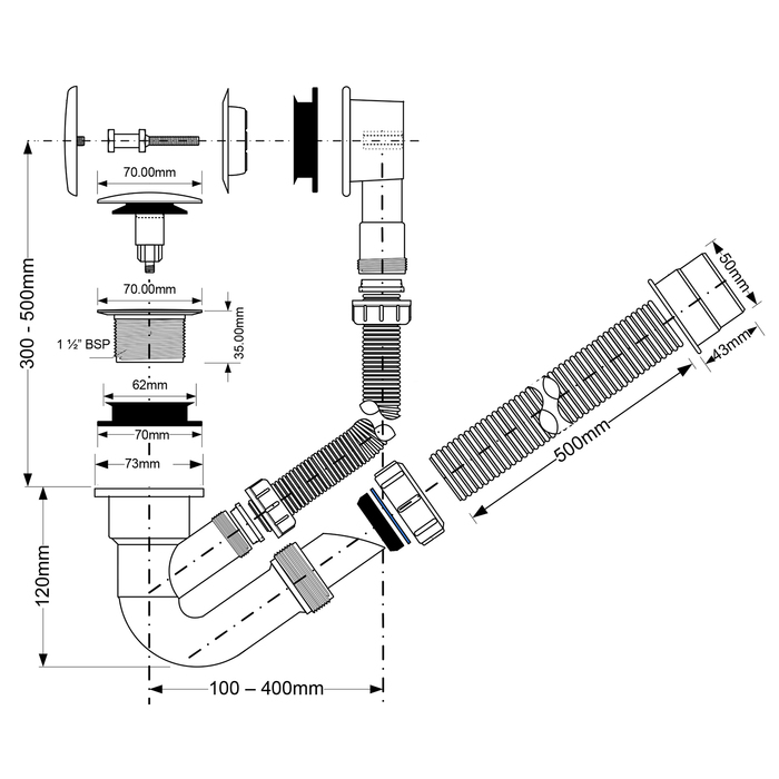 Сифон для ванны McAlpine MRB4CB, 1 1/4"х40/50 мм, с переливом, нажимной кнопкой — это часть системы слива на кухне или в ванной комнате. Изделие предназначено не только для быстрого вывода воды из сантехнического оборудования, но и сдерживания неприятных запахов внутренней части трубы.