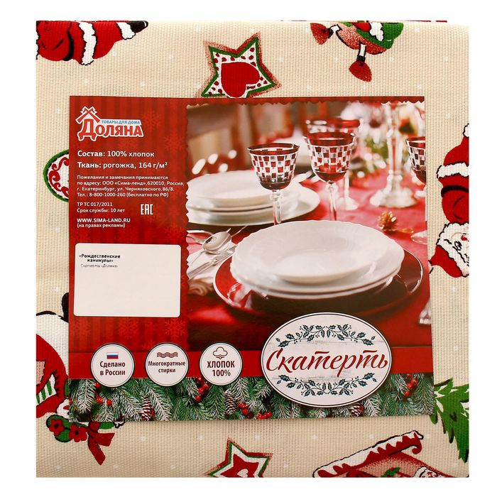 Скатерть украсит праздничный интерьер. Изделие с эксклюзивным принтом сшито из рогожки (100 % хлопок). Этот материал имеет плотную и упругую структуру, обладает высокой прочностью и на ура справляется с первостепенными задачами: