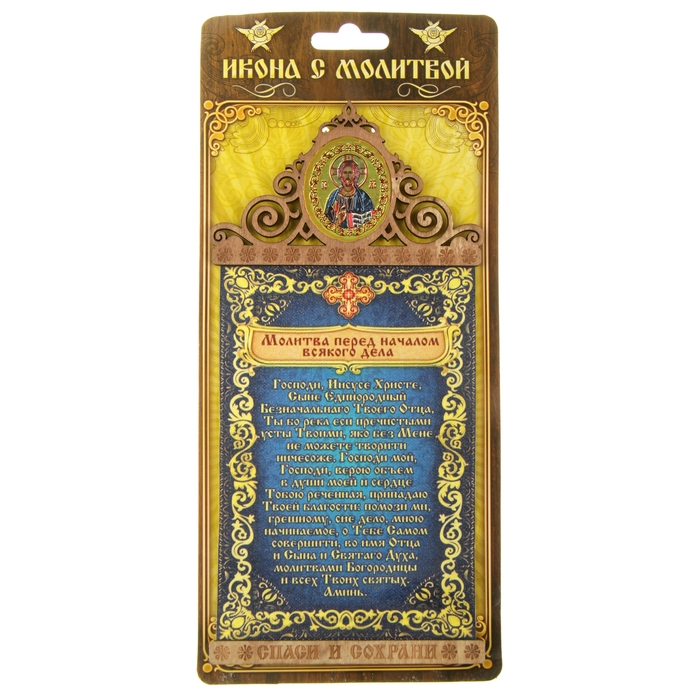 Скрижаль на магните "Молитва перед началом всякого дела" с иконой Господа Вседержителя изготовлено из холста с нанесенным полноцветным изображением и приклеенным к двум деревянным подвесам с ажурным орнаментом. На обратной стороне имеется магнит. На верхнем подвесе вклеена фольгированная икона, которая полностью соответствует канонам Православной Церкви. Панно упаковано на оригинальной подложке. Такое панно-магнит привнесет в Ваш дом согласие и мир и будет прекрасным подарком, оберегающим близких Вам людей.