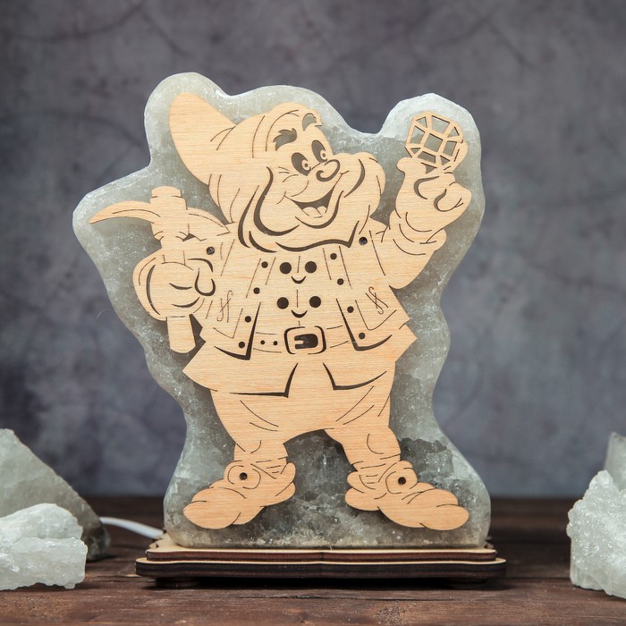 Соляной светильник "Гном", фигурный, деревянный декор, цельный кристалл