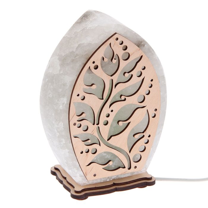 Соляной светильник "Листик" большой с узором 18х12х6 см, деревянный декор, цельный кристалл