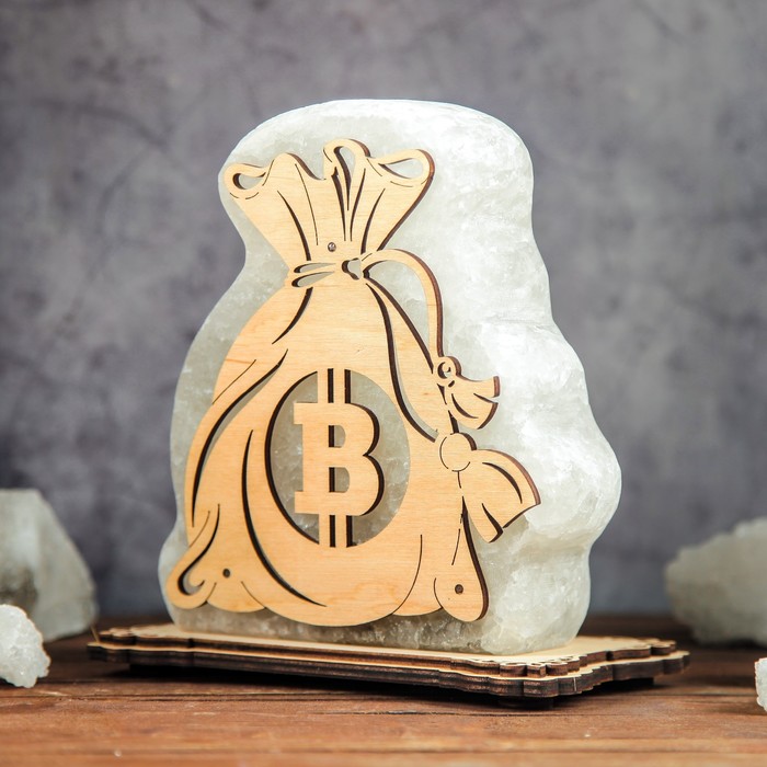 Соляной светильник "Мешок Биткоинов", фигурный, 18 х 18 х 10 см, деревянный декор, цельный кристалл