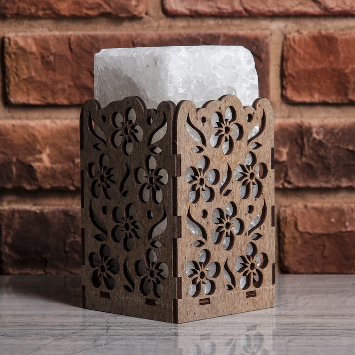 Соляной светильник прямоугольник "Цветы", деревянный декор, цельный кристалл, 10 х 10 х 18 см