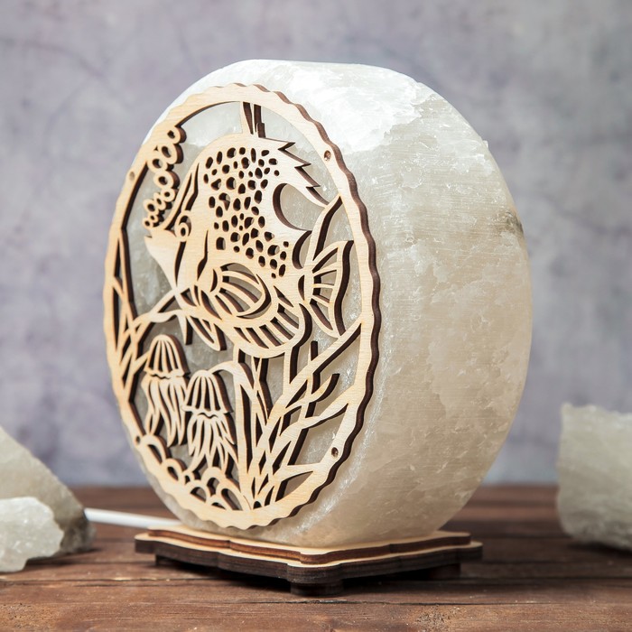Соляной светильник "Рыбка", круглый, деревянный декор, цельный кристалл
