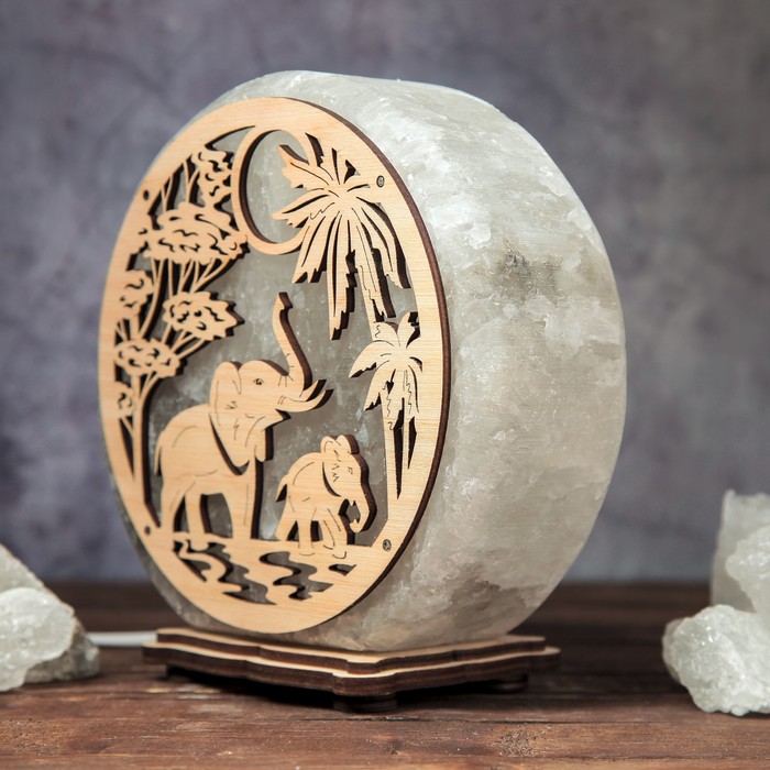 Соляной светильник "Слоны", круглый, деревянный декор, цельный кристалл