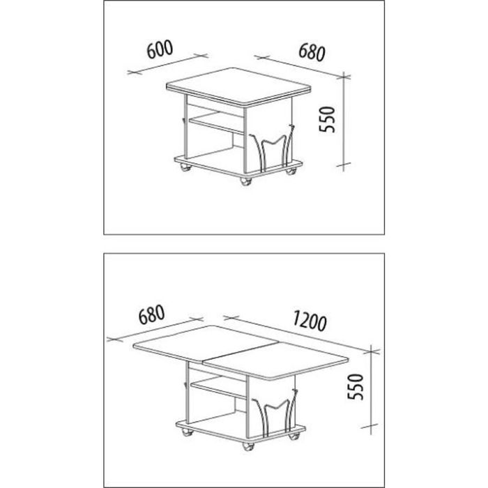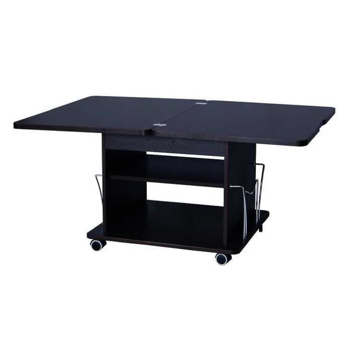 Столешницу можно трансформировать с помощью поворотного механизма. Это позволит увеличить размер её полезной площади. Внизу у модели расположено специальное радиусное углубление, которое выполняет роль ручки. Она также оснащена полочкой и газетницей из металлического прутка.