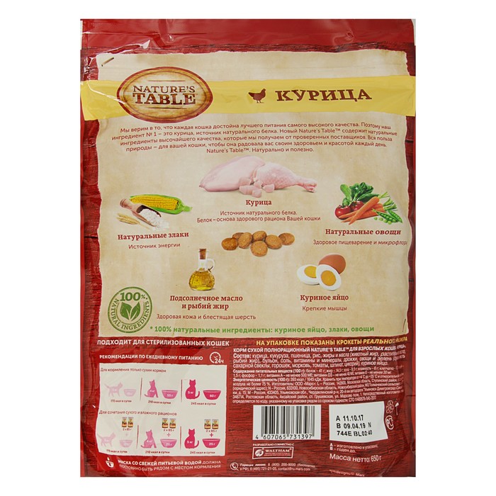 Сухой корм Natures Table для кошек, курица, 650 г — это полнорационное сбалансированное питание, разработанное с учётом возраста, массы тела, физических нагрузок и породных особенностей животного.
