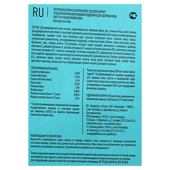 Сухой корм Nutram I20 sensitive skin coat stomach dog для собак, ягненок, 2.72 кг — это полнорационное сбалансированное питание, разработанное с учётом возраста, массы тела, физических нагрузок и породных особенностей животного.