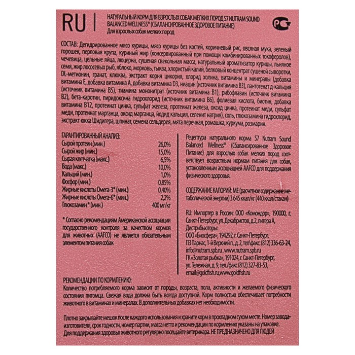 Сухой корм Nutram S7 small breed dog для собак мелких пород, курица, 2.72 кг — это полнорационное сбалансированное питание, разработанное с учётом возраста, массы тела, физических нагрузок и породных особенностей животного.