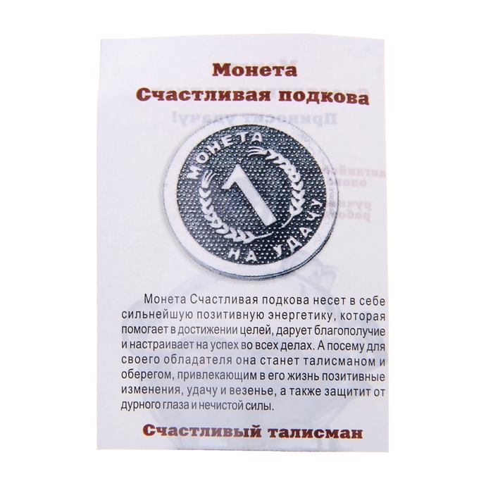 Сувенир "Монета счастливая подкова" — мощный амулет, способный не только улучшить материальное положение обладателя, но и помочь в решении многих жизненных задач, так как он притягивает положительную энергию.