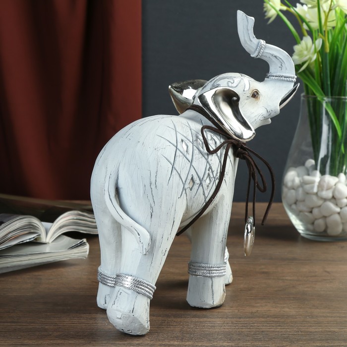 Хотите пожелать близким успеха и процветания? Вручите им фигурку слона! Ведь именно это благородное животное в странах Азии и Африки является символом благополучия и стабильности. Считается, что слон привлекает в дом положительную энергию. Поставьте его на подоконник, так, чтобы он смотрел на улицу. Сувенир полистоун "Слон с серебристыми ушами с сердцем на шее - хобот вверх" 20,2х19,2х7см украсит собой окружающее пространство, добавив ему этнический колорит.