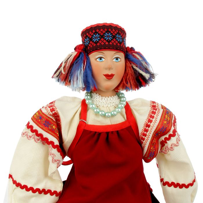 Сувенирная кукла выполнена российскими мастерами вручную, начиная от этапа замешивания фарфора и заканчивая росписью и пошивом наряда. Великолепное одеяние детально проработано, в нём чувствуется рука настоящего мастера, который кропотливо выкроил миниатюрные детали платья, используя несколько видов ткани.