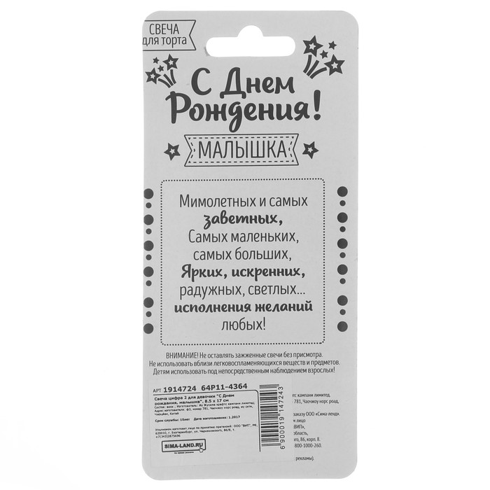 Свеча цифра 2 для девочки "С Днем рождения, малышка" — непременный атрибут праздника, который бывает раз в году! Он обязательно поднимет настроение виновнику торжества.