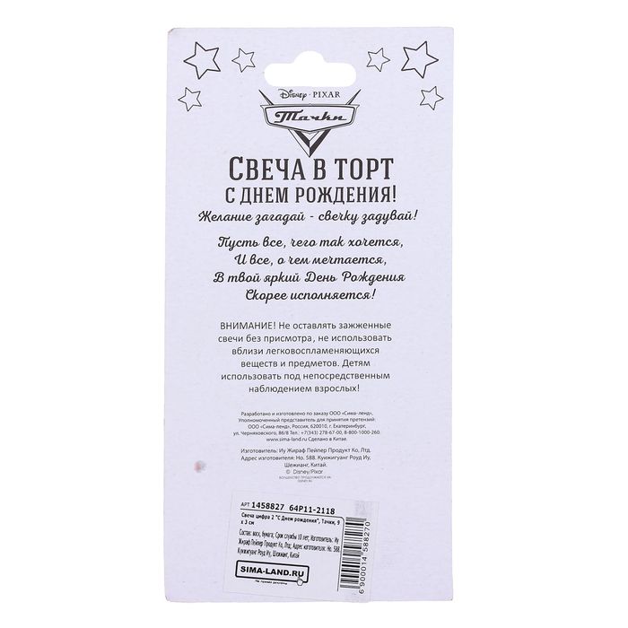 Свеча в торт цифра Дисней 2 "С Днем рождения", Тачки