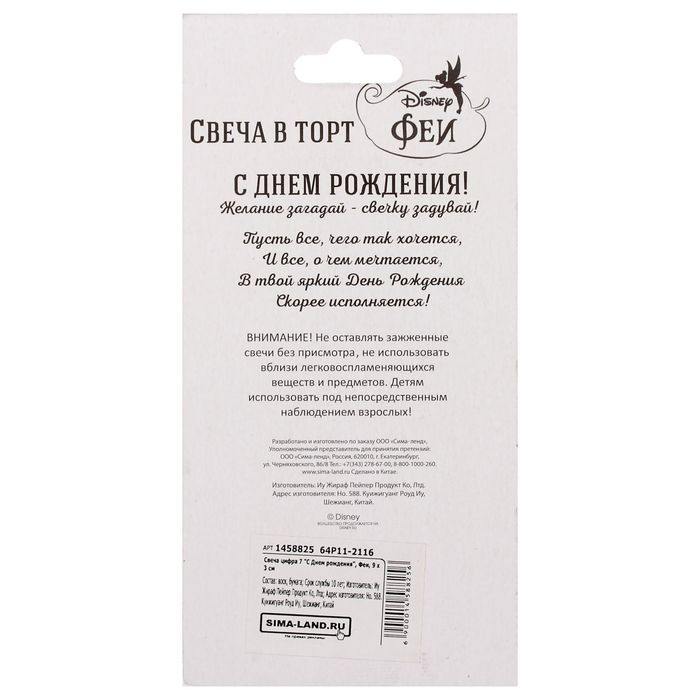Свеча в торт цифра Дисней 7 "С Днем рождения", Феи