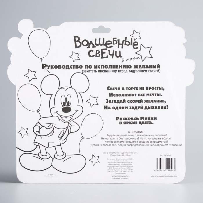 Свеча в торт Дисней буквы "С Днем рождения", Микки Маус
