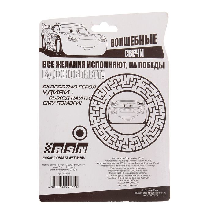 Свеча в торт Дисней "С днем рождения" Тачки 8 шт