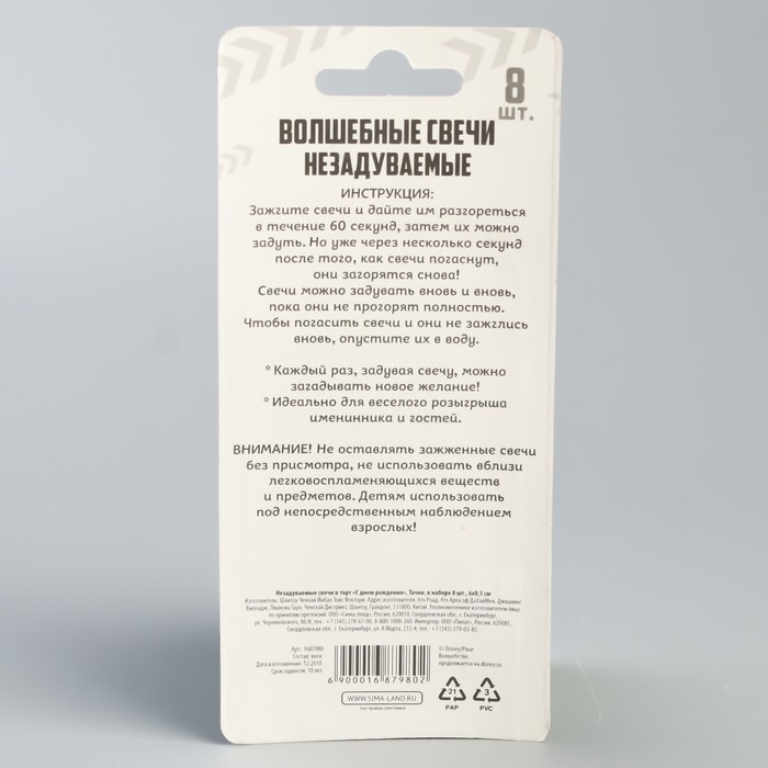 Свеча в торт незадуваемая Дисней "С Днем рождения", Тачки, (набор 8 шт)