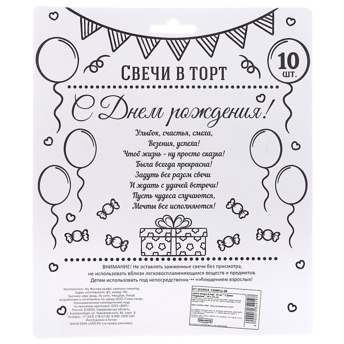Свечи витые в торт "С днем рождения" 10 шт.