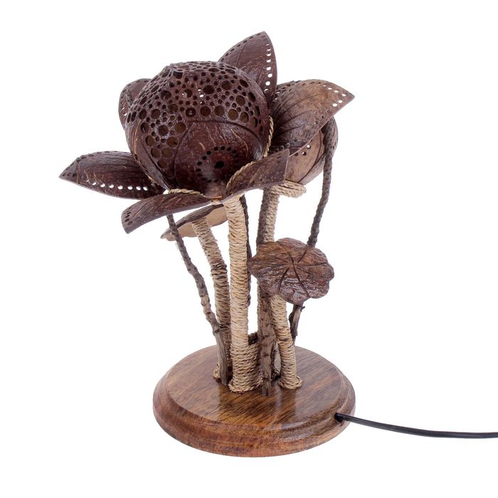Экзотический светильник из натуральных материалов эффектно дополнит пространство. Каждый элемент вырезан и расписан мастерами вручную. Благодаря необычной форме и декоративным элементам такой аксессуар станет отличным решением для оформления прикроватной зоны, а в тёмное время суток порадует необычными узорами, рассеивающимися по всей комнате.