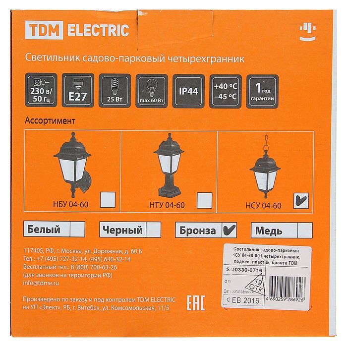 Светильник TDM, садово-парковый, четырёхгранник, подвесной, цвет бронза, SQ0330-0716