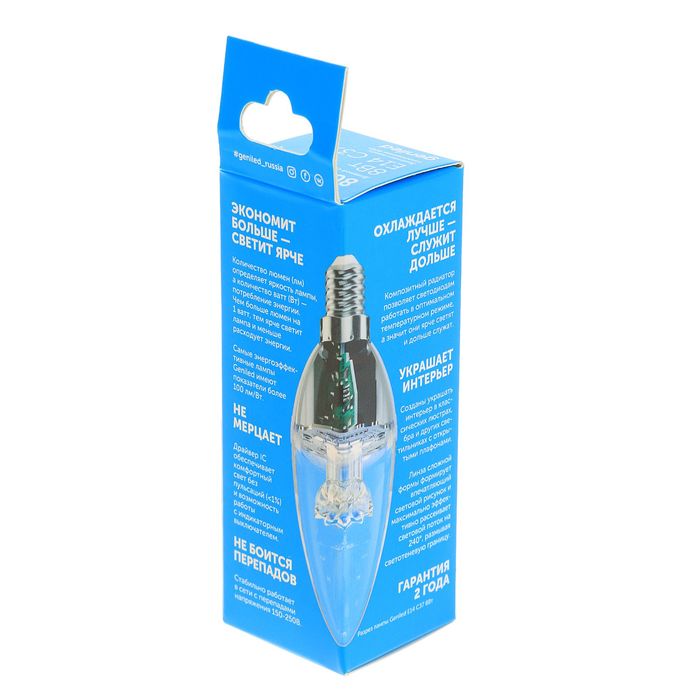 Лампа светодиодная Geniled Е14 свеча не содержит ртути, поэтому имеет высокие экологические показатели. Устройство прослужит в 40 раз дольше, чем галогенная лампа, и тем более, — чем традиционная лампа накаливания 40 Вт.