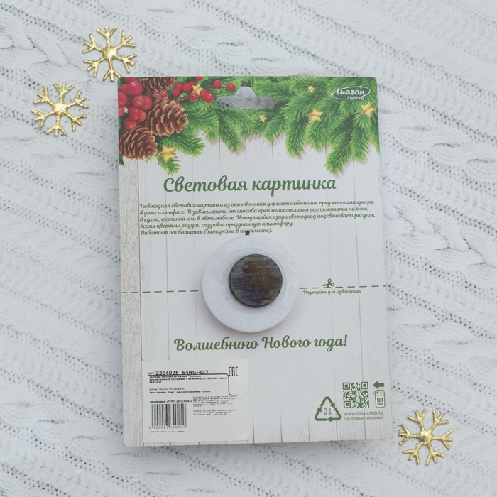 С помощью такой цветной картинки вы сможете поздравить близких с Новым годом, дополнить основной подарок или оформить квартиру и офис. Изделие порадует не только красочным изображением, но и своим свечением: огоньки всегда ассоциируются с праздником и создают рождественскую атмосферу. Пусть эта приятная мелочь подарит тёплые воспоминания.