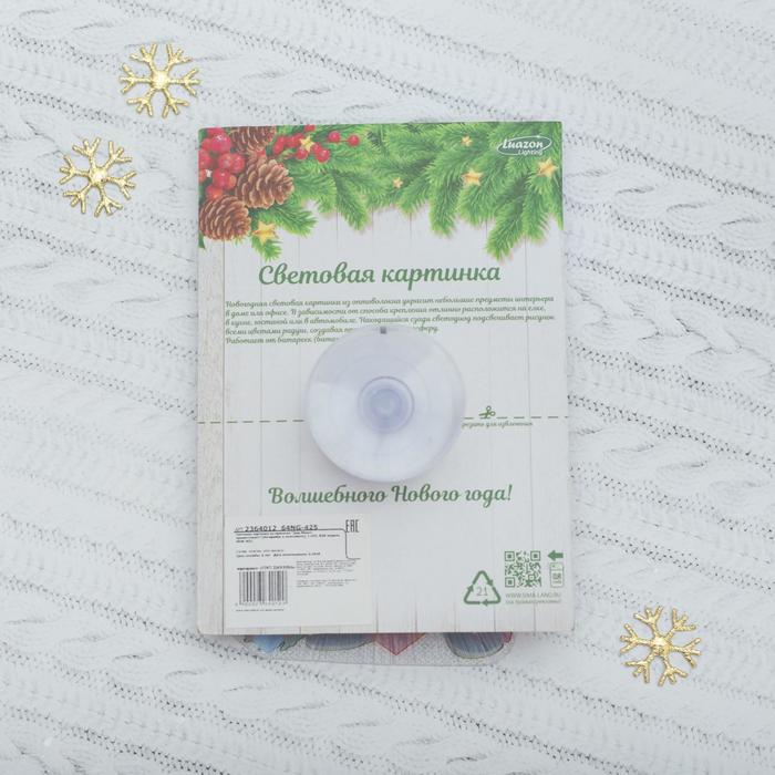 С помощью такой цветной картинки вы сможете поздравить близких с Новым годом, дополнить основной подарок или оформить квартиру и офис. Изделие порадует не только красочным изображением, но и своим свечением: огоньки всегда ассоциируются с праздником и создают рождественскую атмосферу. Пусть эта приятная мелочь подарит тёплые воспоминания.