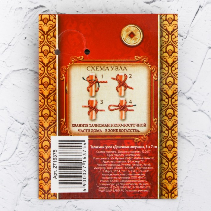 Талисман-узел "Денежная лягушка", 8 х 7 см — сувенир в полном смысле этого слова. И главная его задача — хранить воспоминание о месте, где вы побывали, или о том человеке, который подарил данный предмет. Преподнесите эту вещь своему другу, и она станет достойным украшением его дома.