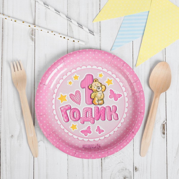 Тарелка бумажная "1 годик", 18 см, цвет розовый (набо 6 шт)