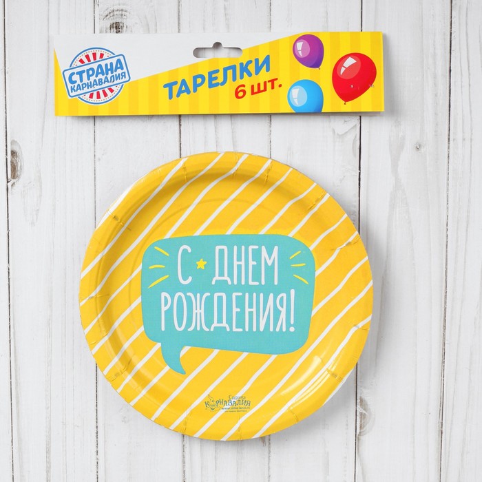 Тарелка бумажная "С Днём Рождения", полосочка, набор 6 шт., 18 см