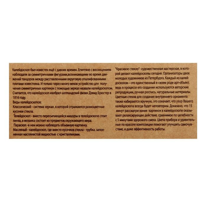 Данный телейдоскоп создан по индивидуальному авторскому эскизу, поэтому другого такого же не найти! Здесь и кропотливая работа художников, и особая оптика, и, конечно, использование различных материалов для декора.