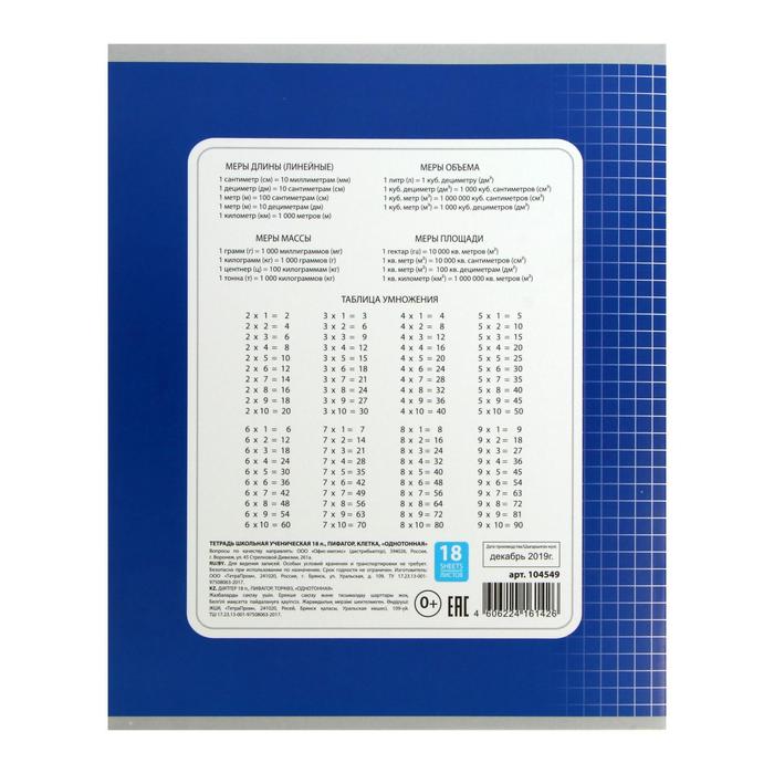 Тетрадь ПИФАГОР, 18 листов, клетка, офсет №2, обложка мелов картон, блок 60 г/м2
