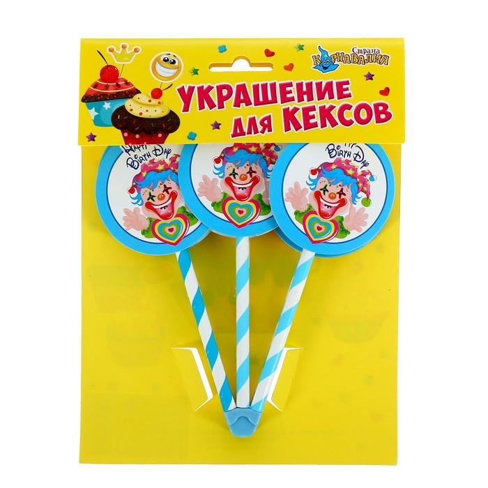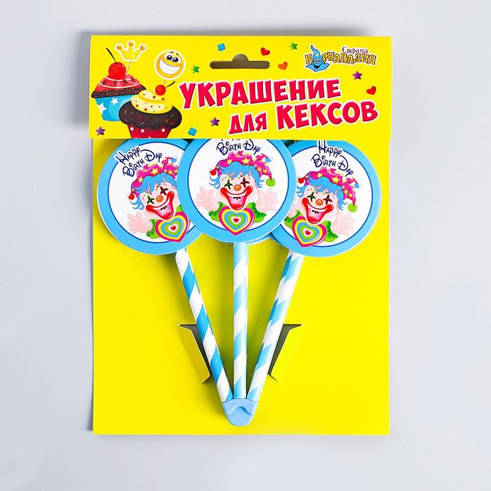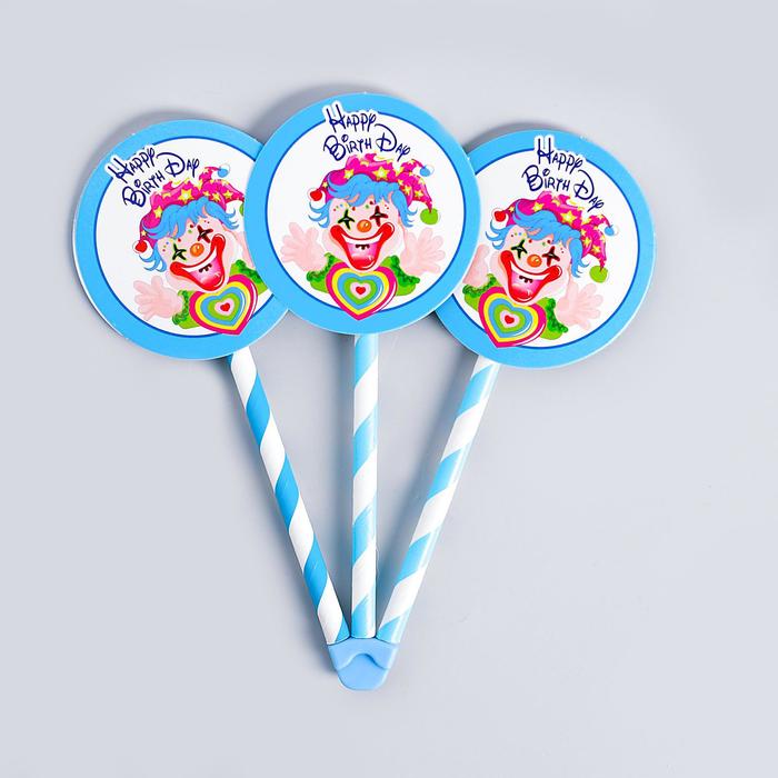 Топпер "С Днем рождения" клоун с сердцем, голубой цвет (6 шт на держателе)