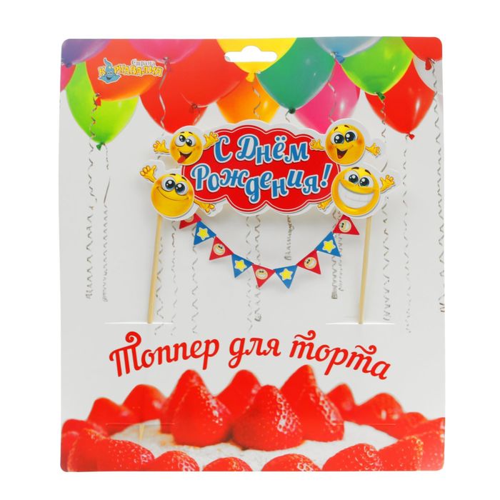 Топпер в торт с гирляндой "С днем Рождения"смайлик