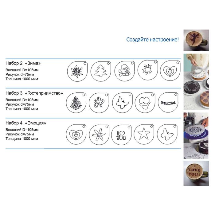 От качества посуды зависит не только вкус еды, но и здоровье человека. Трафареты "Эмоция" для декора тортов и кексов, набор, 10,5 х 7,5 см — товар, соответствующий российским стандартам качества. Любой хозяйке будет приятно держать его в руках. С нашей посудой и кухонной утварью приготовление еды и сервировка стола превратятся в настоящий праздник.
