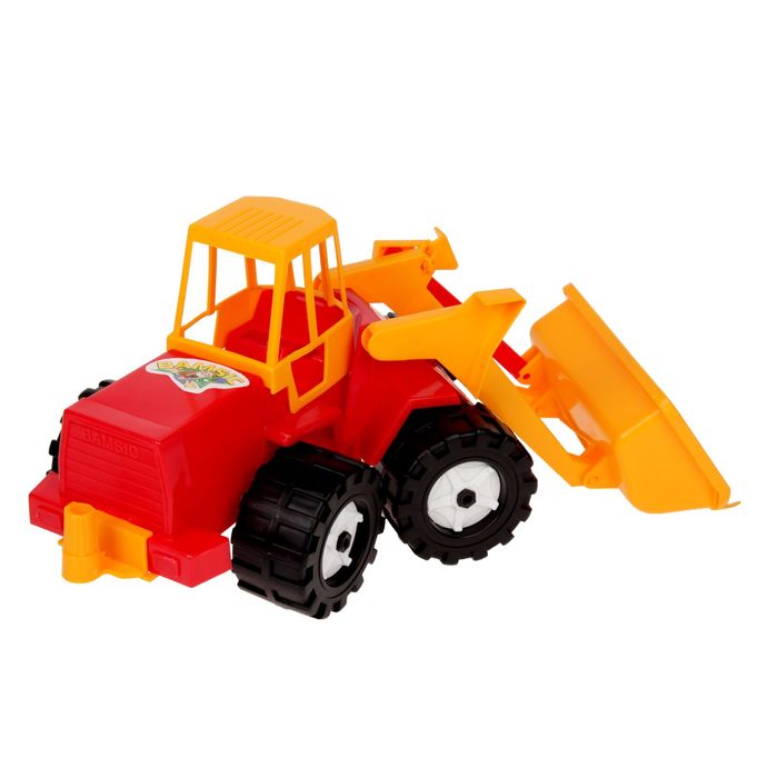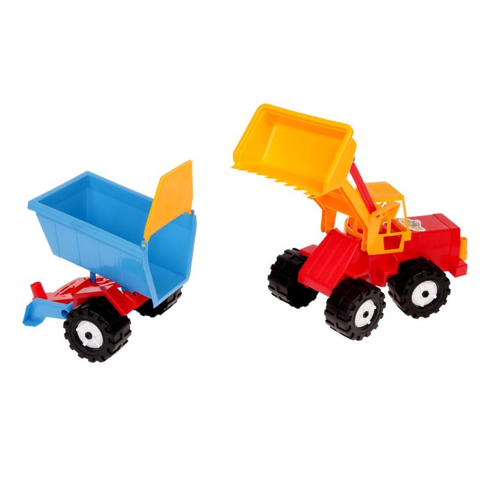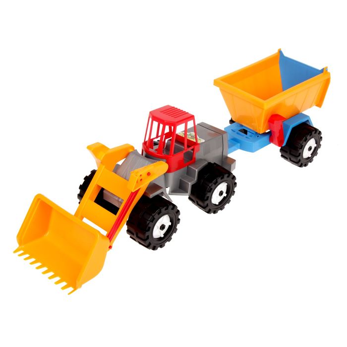 Трактор-погрузчик — спецтехника для юных строителей. Он оснащён широким ковшом для копания песка и мелких камушков. К фаркопу на заднем бампере присоединяется прицеп с откидным кузовом. Во время опрокидывания задний борт открывается. Такая игрушка идеально подойдёт для развлечений дома и на улице.