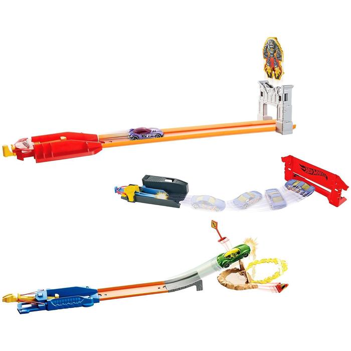 Соберите серию прямых трасс Hot Wheels с опасными препятствиями. В наборе «Робот-крушитель» огромная груда металла попытается раздавить вашу машинку. Пройдите кольцо огня в «Головокружительном прыжке» или сразитесь с опасной змеёй в «Пещере кобры», если хотите проехать дальше. Для начала просто оттяните резинку и запустите автотранспорт на большой скорости!