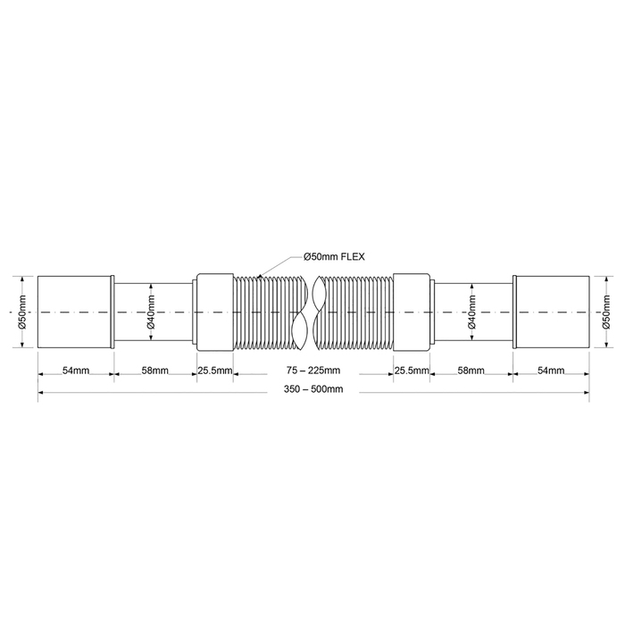 Труба гофрированная McAlpine MRMF205A, 40/50х40/50 мм, раздвижная, L350-500мм — это часть системы слива на кухне или в ванной комнате. Изделие предназначено не только для быстрого вывода воды из сантехнического оборудования, но и сдерживания неприятных запахов внутренней части трубы.